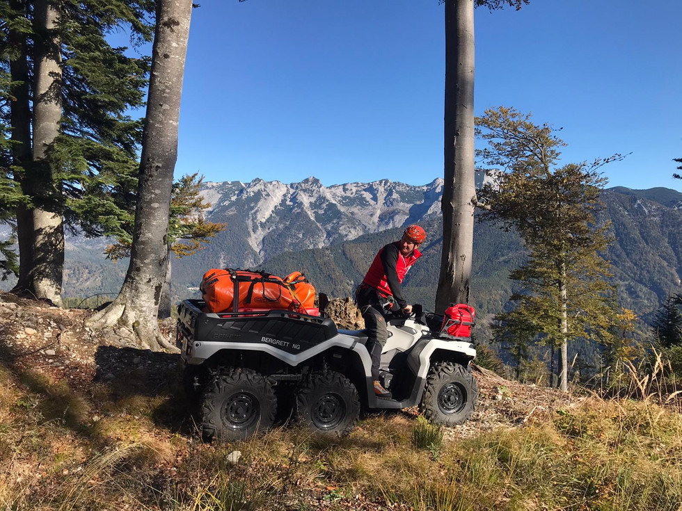 Die Auffahrt erfolgt im Einvernehmen mit dem dortigen Jäger über die Forststraße an der Hasenbachstube vorbei bis auf 970m Seehöhe. Zwei Suchtrupps steigen durch das Steilgelände ab. 150Hm tiefer konnte das erste Mädchen auf einem Geländerücken mit einer Beinverletzung rasch aufgefunden werden. Während der Erstversorgung und Vorbereitung der mitgebrachten Trage um die Verletzte durch den Graben Richtung FS Hallergraben abzuseilen, kommt es zu einer Real-Alarmierung: Abgestürzter Bergsteiger am Zustieg zum Katrinklettersteig: Die EL unterbricht die Übung, ein Stoßtrupp wird mittels Canam-Quad losgeschickt, mit dem Auftrag den alarmierten NA-Hubschrauber Martin 3 bei der Bergung zu unterstützen. In recht kurzer Zeit kann über die Katrinabfahrt aufgefahren werden. Eine 2. Mannschaft bleibt standbye bei der Hasenbachstube in Bereitschaft. Nach Überflug der Unfallstelle bei der Katrin durch Martin 3 kommt per Funk die Meldung, dass mit Unterstützung der 5 Bergretter vor Ort die Versorgung und Bergung machbar sei. Nach erfolgter Taubergung kann die Übung wie geplant fortgesetzt werden. Das 2. Mädchen ist schwer verletzt, wird ärztlich versorgt und über 250Hm in der Trage abgeseilt und anschließend am Steig entlang des Baches zu den wartenden Einsatzfahrzeugen getragen. Um das Bachbett einfacher überwinden zu können, bauen die Bergretter eine 100m lange Seilbahn mit den modernen Dyneemaseilen.