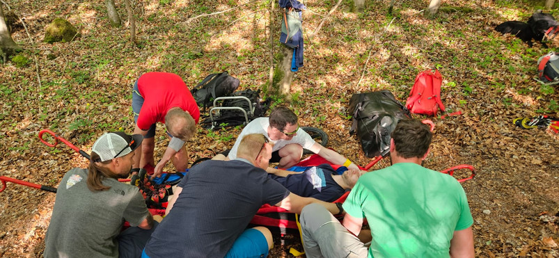 Im Einsatzfall muss jeder Handgriff sitzen. Wir nutzten die Montagsübung, um die verschiedenen Tragesysteme für die terrestrische Bergung durchzutesten. Dabei wurden auch die möglichen Patientenlagerungen auf den Tragen simuliert.